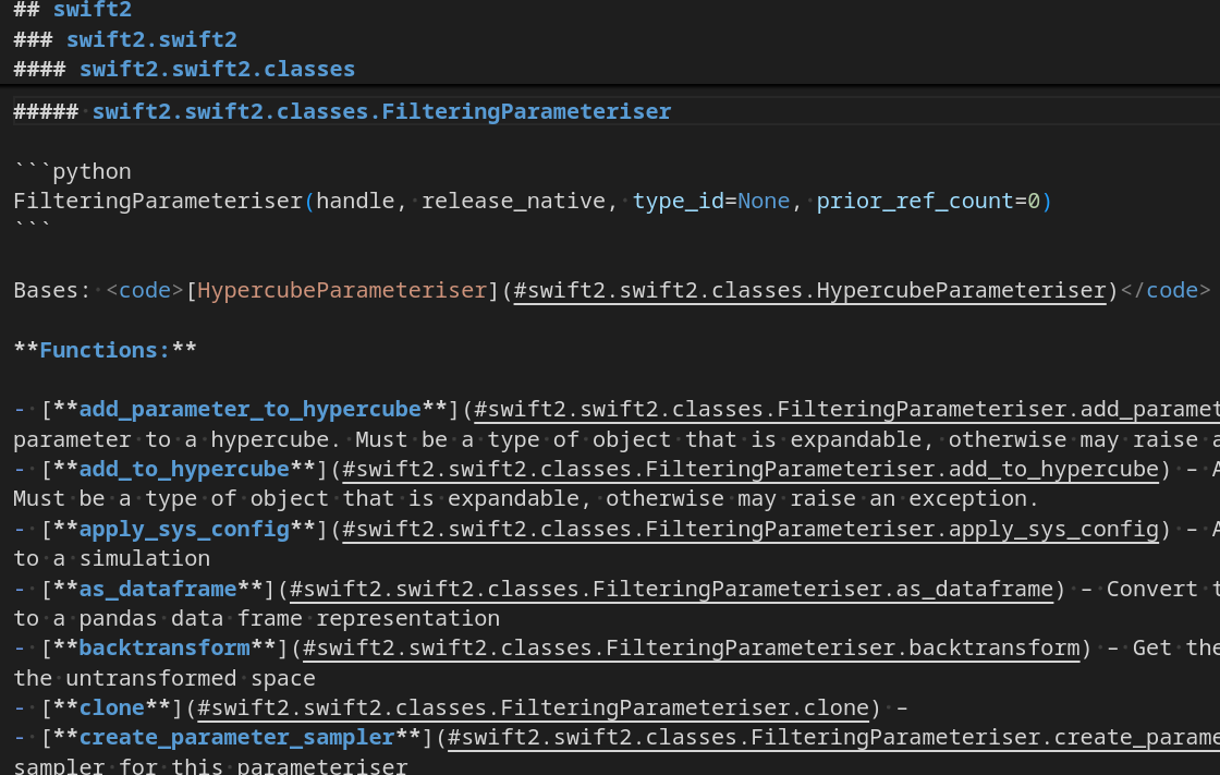 griffe2md ~/src/swift/bindings/python/swift2/swift2/ -o swift2_api.mdWe have a 677K document with 19,000 lines. Not sure what this means in terms of tokens for an LLM. Noted, but I don’t want to preempt removing information unless warranted or needed.